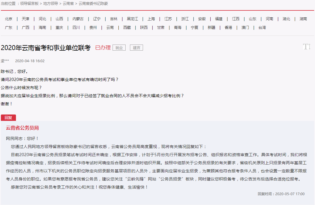 受疫情影響,2020年各類考試都推遲進行,在就業(yè)嚴峻的情況下,眾多考生非常關注2020云南省考何時開始。近日,在“人民網領導留言板”欄目中云南省公務員局就何時開展2020省考進行了答復,具體內容如下: