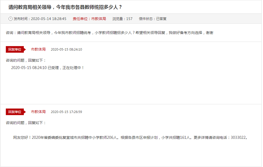 在5月14日,有網(wǎng)友在宣城市教育體育局互動(dòng)交流平臺(tái)提問(wèn):請(qǐng)問(wèn)教育局相關(guān)領(lǐng)導(dǎo),今年我市教師招聘統(tǒng)考,小學(xué)教師招聘招多少人?宣城市教體局也是給出了如下回復(fù):2020年省委編委批復(fù)宣城市共招聘中小學(xué)教師206人。根據(jù)各縣市區(qū)申報(bào)計(jì)劃,小學(xué)共招聘161人。