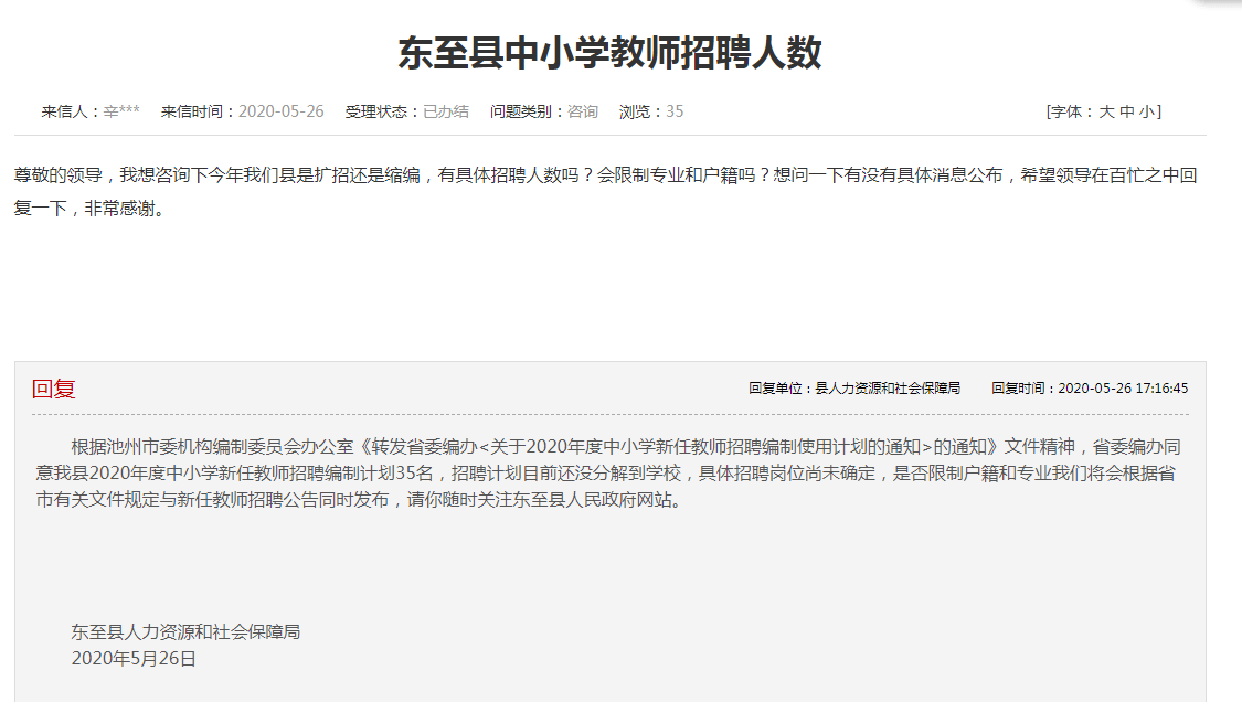 縣人力資源和社會(huì)保障局回復(fù)根據(jù)池州市委機(jī)構(gòu)編制委員會(huì)辦公室《轉(zhuǎn)發(fā)省委編辦<關(guān)于2020年度中小學(xué)新任教師招聘編制使用計(jì)劃的通知>的通知》文件精神,省委編辦同意我縣2020年度中小學(xué)新任教師招聘編制計(jì)劃35名,招聘計(jì)劃目前還沒分解到學(xué)校,具體招聘崗位尚未確定,是否限制戶籍和專業(yè)我們將會(huì)根據(jù)省市有關(guān)文件規(guī)定與新任教師招聘公告同時(shí)發(fā)布,請(qǐng)你隨時(shí)關(guān)注東至縣人民政府網(wǎng)站。
