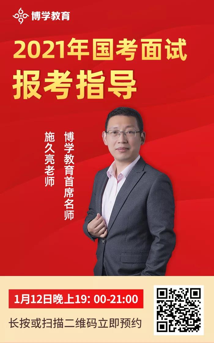 不打無準(zhǔn)備之仗,為幫助考生們備考2021年國(guó)考面試,博學(xué)教育將于1月12日晚上19:00舉辦直播講座。首席名師施久亮老師帶您提前了解歷年國(guó)考面試的基本情況,以及不同部門的試題特點(diǎn)和評(píng)分要點(diǎn)等等,并提供專業(yè)的備考建議,干貨滿滿!