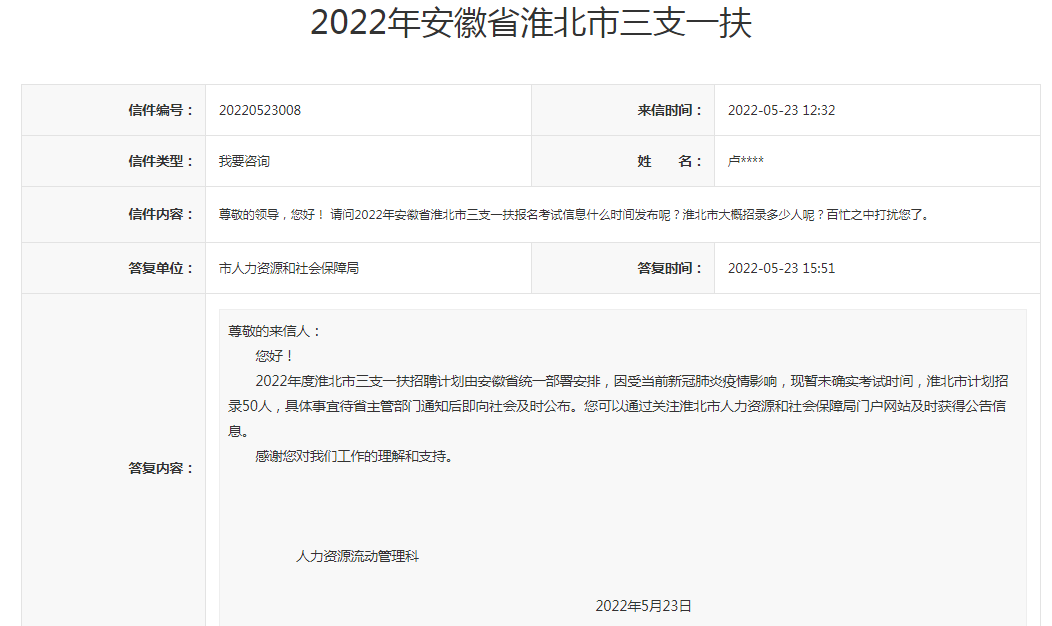 領(lǐng)導,您好!請問2022年安徽省淮北市三支一扶報名考試信息什么時間發(fā)布呢?淮北市大概招錄多少人呢?百忙之中打擾您了。