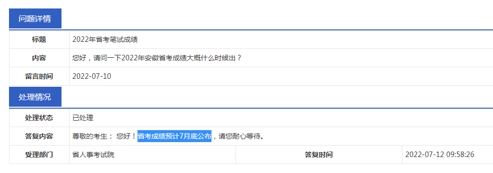 2022安徽省考筆試于7月9日-10日結(jié)束,相信很多小伙伴都比較關(guān)心公布成績的消息,以下是安徽博學(xué)教育小編在安徽省人社廳的互動交流欄目看到的官方信息回復(fù),希望對有事幫助!