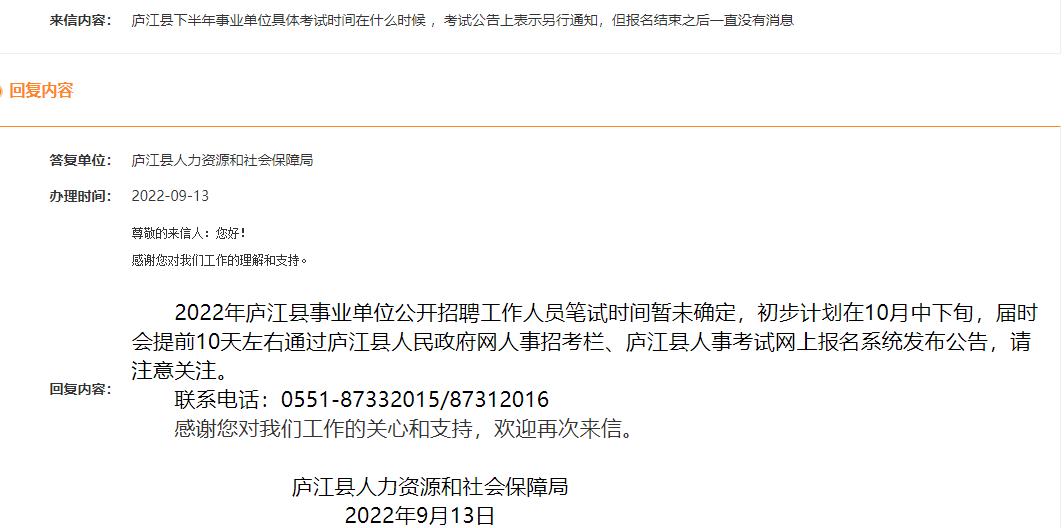 來信內(nèi)容:8月份出的廬江事業(yè)單位考試想知道什么時候出考試時間,麻煩回復(fù)一下,謝謝