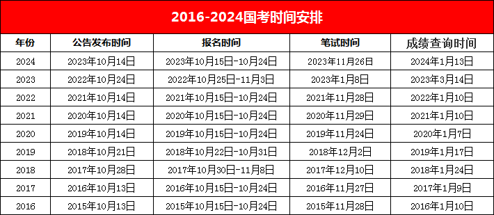 以下是歷年國(guó)考時(shí)間安排,僅供參考: