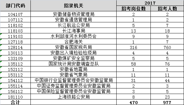 2018國家公務員考試職位表(安徽地區(qū))共招聘470崗位,977人。