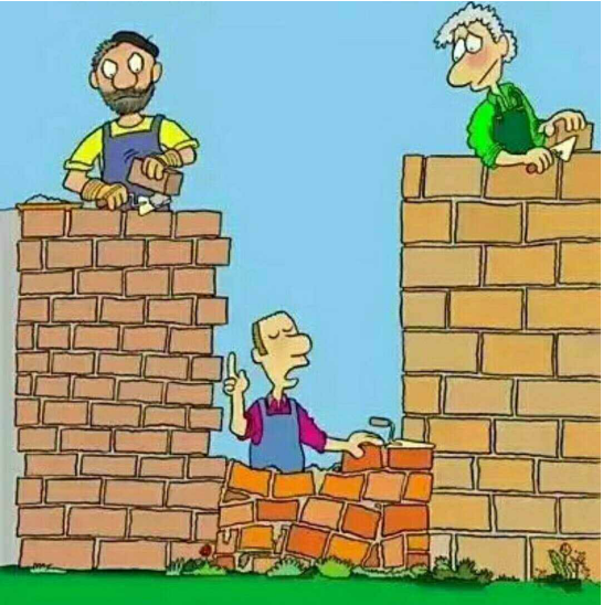 1、漫畫(huà)題:三個(gè)人砌墻,旁邊兩個(gè)人都砌得很高了,中間一個(gè)很少,而且磚歪歪斜斜的。三個(gè)人用了大小不同的磚塊。