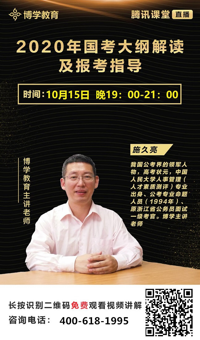 為了提高報(bào)名和備考的針對性和有效性,請鎖定10月15、16日晚19:00博學(xué)教育首席老師——施久亮老師2020國考報(bào)名指導(dǎo)及大綱解讀的騰訊直播課!你想知道的統(tǒng)統(tǒng)都會(huì)有,還可以實(shí)時(shí)互動(dòng)!